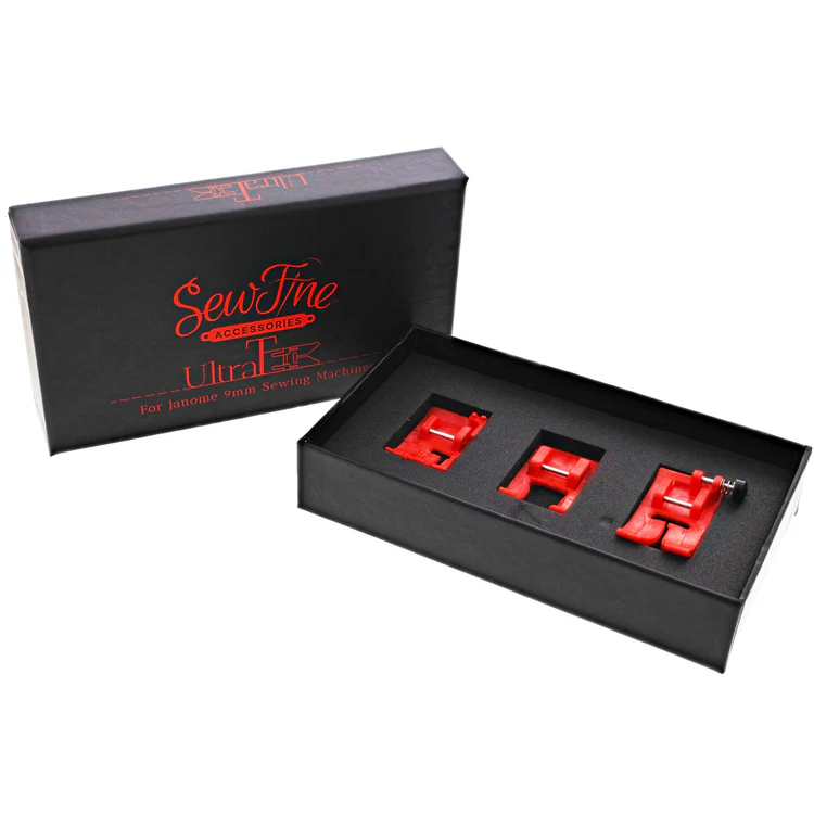 NON-STICK! The Sew Fine Ultra T High Performance Presser Foot Set for Janome 9MM machines includes three feet made of a more durable synthetic resin than typical non-stick feet. These feet are resistant to the scarring produced by a sewing machine’s feed system yet virtually reduces any friction between the presser foot and the top layer of fabric. This provides a smoother flow of the fabric while sewing greatly improving stitch quality and fabric control.